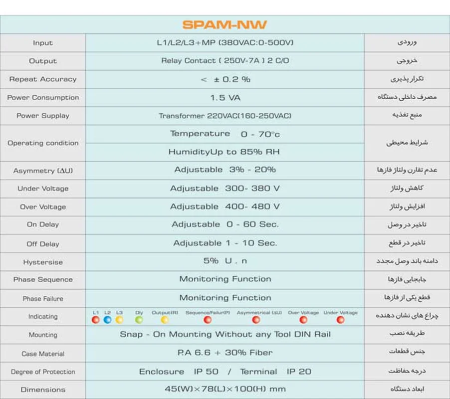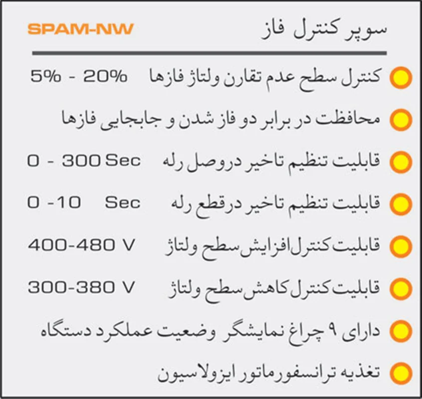 قابلیت تشخیص سطح عدم تقارن ولتاژ فازها ، نبودن یکی از فازها ، جابجایی فازها ، کاهش ولتاژ ، افزایش ولتاژ و نیز دارای تابع تاخیر عملکرد وصل و قطع رله خروجی .