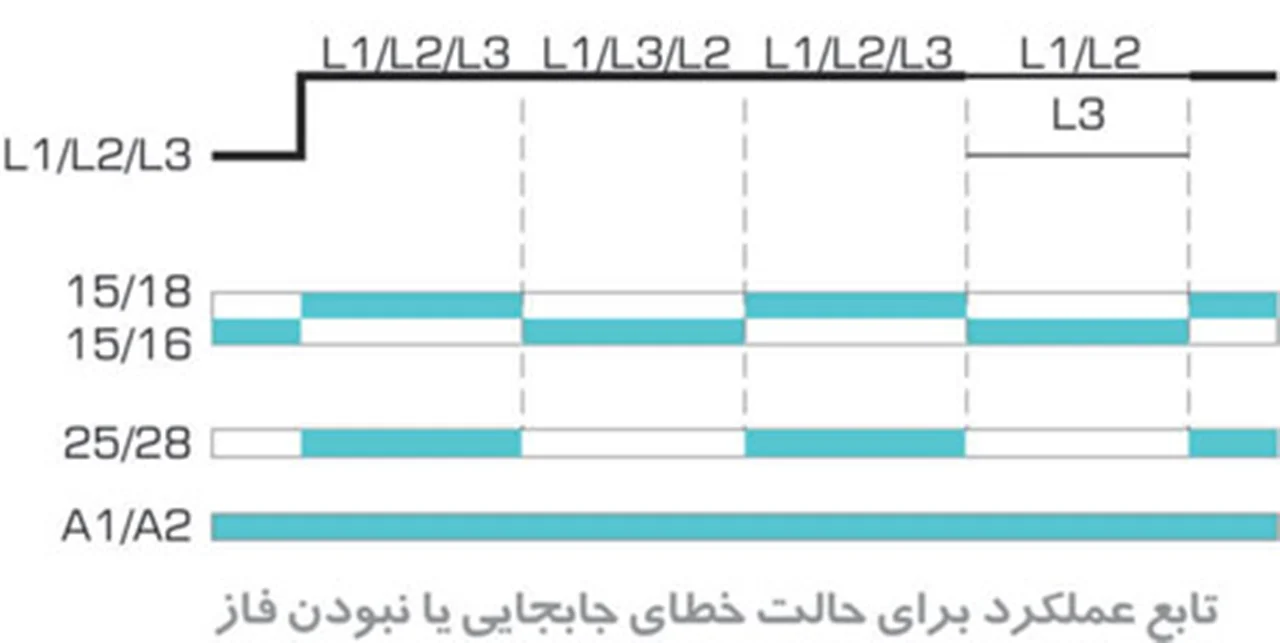 در صورت جابجایی فازها (رعایت نکردن توالی فازها ) و یا نبودن یکی از فازها ، دستگاه مستقل از تابع تاخیر فرمان رله خروجی را می دهد .