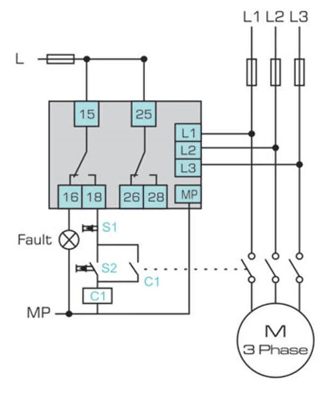 L1 / L2 / L3 و نول را به ترمینال MP متصل نمائید . بسته به تنظیمات دستگاه و شرایط برق ورودی چراغ های مرتبط با هر یک از نقص های دستگاه فعال یا غیرفعال خواهند شد . در صورتی که چراغ P روشن شود در صورت اطمینان از برقراری سه فاز بایستی جای فازهای ورودی جابجا شود .