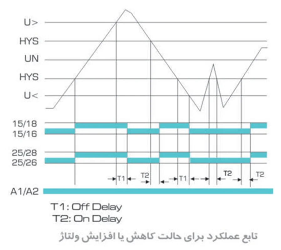 جهت اطمینان از پایداری ولتاژ ورودی شبکه ، دستگاه دارای زمان تاخیر قابل تنظیم در محدوده های 60-0 یا 30-0 ثانیه در وصل رله خروجی می باشند